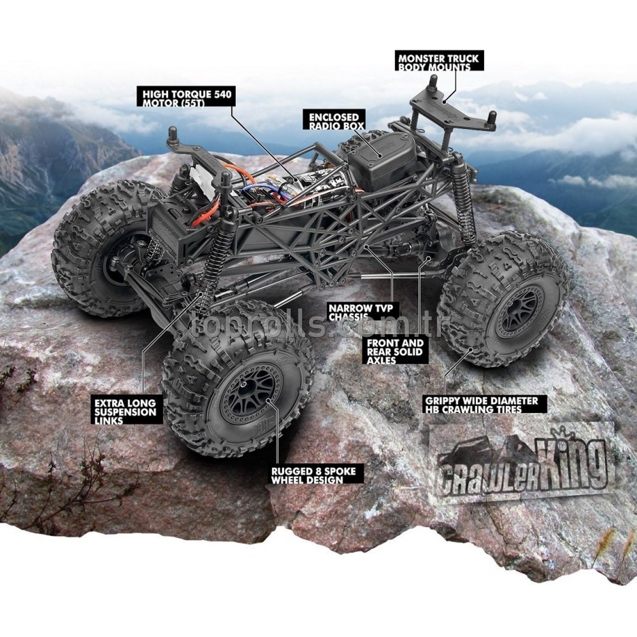 Dört tekerlekten çekişli, güçlü Crawler King ile her türlü araziye çıkın! Su geçirmez komponentler, tam zamanlı 4WD ve süper sert düz akslarla donatılan Crawler King, en dik kayaların üzerinden geçebilir ve derin akıntıları terletmeden atabilir!