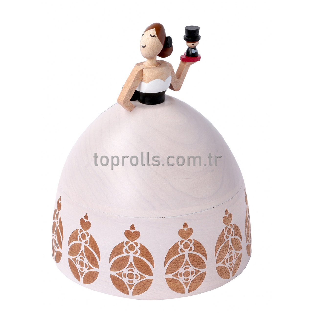 Tamamı el yapımı ve organik boya ile boyanmış olan Gelin ve Damat konseptli bu Müzik Kutusu, Kanada meşesinin ahşap malzemesinden yapılmıştır. Japon Sankyo melodi mekaniği kullanılmıştır. Ayrıca tamamı doğaya duyarlı, geri dönüşüme uygun ürünlerdir. Ürün hareketi; gelinin kendi ekseninde dönmesidir. Boyu: 114mm X 114mm X 135mm'dir.