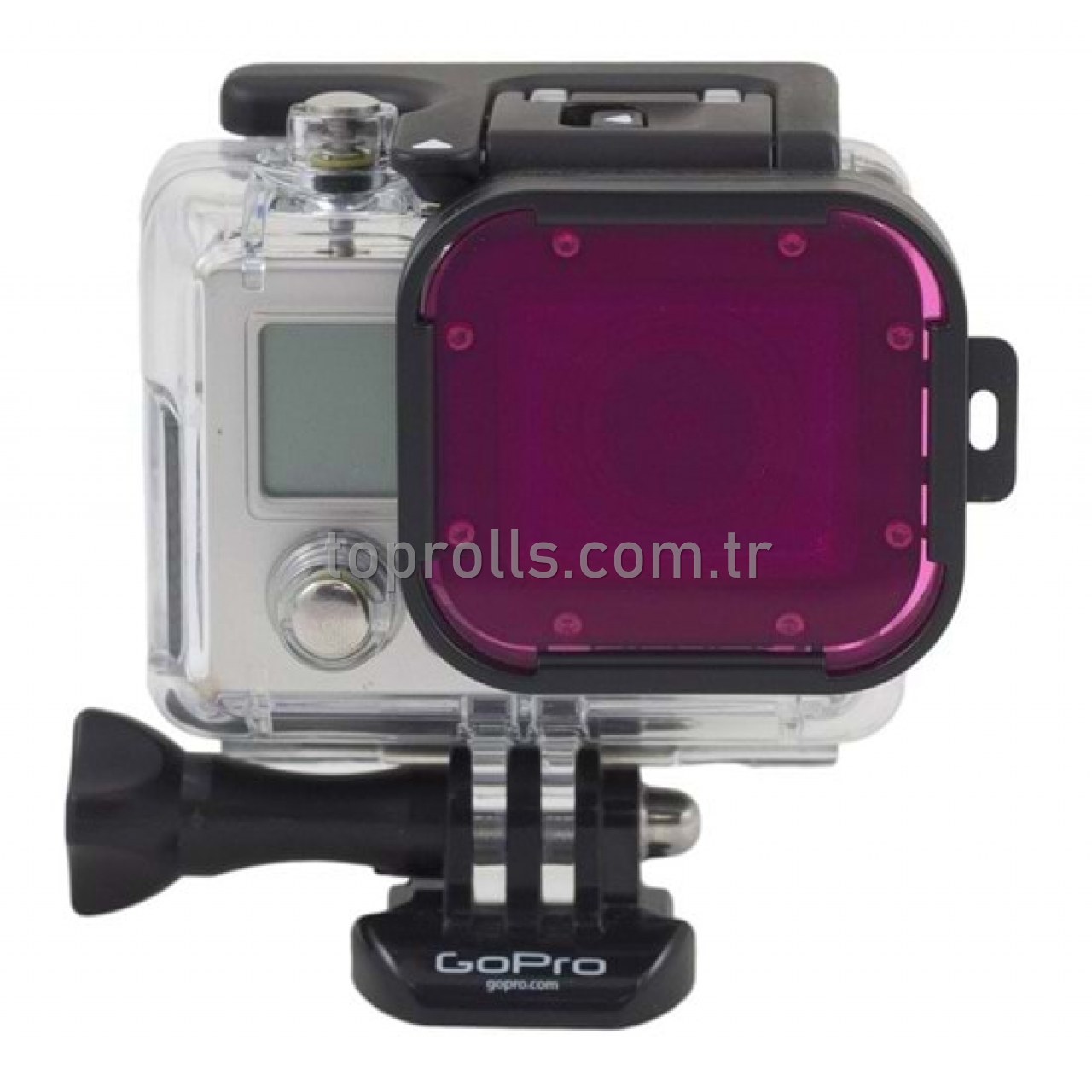 Filtre GoPro'un sualtı gövdesinin lens portuna takılan ve kapayan ince bir çerçeveye yerleştirilmiştir.