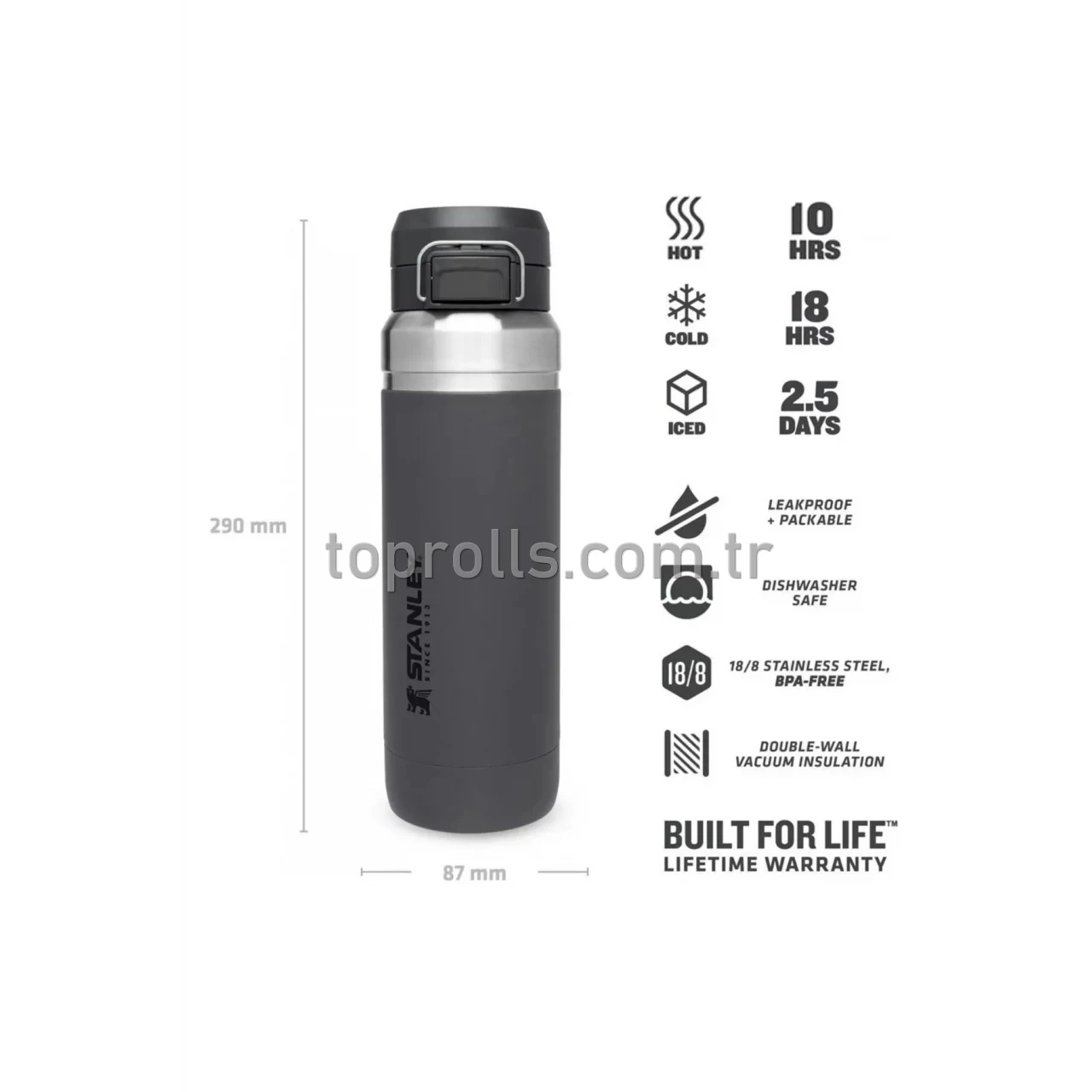 İçecekleri 10 saate kadar sıcak, 18 saate kadar soğuk ve 60 saate kadar buzlu tutar. Açık hava maceraları için mükemmel bir yol arkadaşıdır. Kilitli bir kapağa sahiptir, bir damla bile dökmeden çantanda rahatlıkla taşıyabilirsin. Stanley ürünleri, üretimden kaynaklanan hatalar, ısı muhafaza problemleri veya akıtma/sızdırma gibi sorunlara karşı ömür boyu garantilidir. Çift duvar vakumlu yalıtım, 18/8 paslanmaz çelikHafif, çizilmelere dayanıklı, pas yapmayan, BPA sız malzemelerden üretilmiştir.Hareket halindeyken bile rahat içim sunar.Tek tuşla kilitlenen sızdırmaz kapak sayesinde rahatlıkla taşınır.Bulaşık makinesinde yıkanabilir.Kapasite: 1.06 L